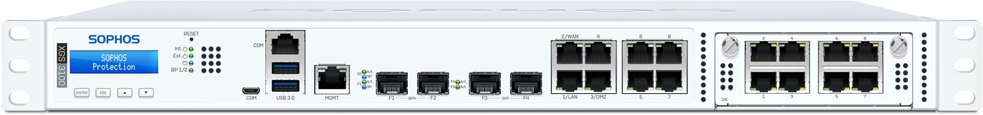 XGS 3100 HW Appliance with 8 GE + 2 SFP + 2 SFP+ ports, 1 expansion bay for optional Flexi Port module, SSD + Base License (incl. FW, VPN & Wireless) for unlimited users + power cable